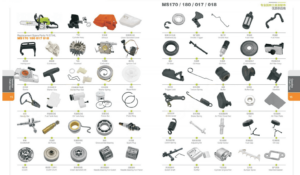 Fuel tank, Ignition Coil, Flywheel, Carburetor, Crankshaft, Crankcase, Oil seals, Gaskets,Clutch, Bearing, Manifold, Muffler, Nearing Bearing, Clutch Spring, Flywheel Cover, Spark plug, Piston, Piston Rings, Cylinder, Air Filter, Intet Pipe, Fuel Filter, Starter Assy, Starter Spring, Starter Wheel,Sprocket, Connect Plate, Snap Ring, Rubber Insert, Aluminium Pipe, Drive shaft, Switch Handle, Belt, Oily Bearing, Splined Shaft, Grass Protector, Pulley, Gear Wheel etc.